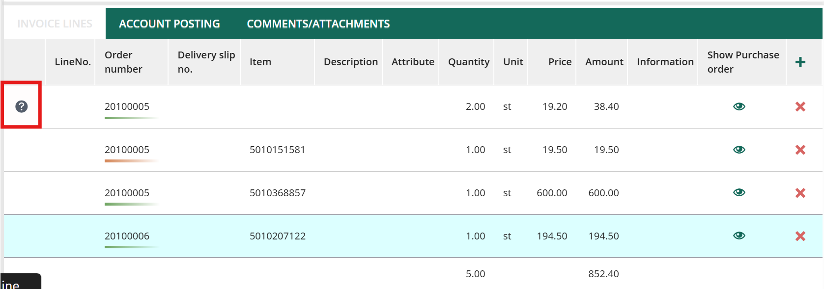 There may be several reasons for this status, e.g. The order number is missing in Rillion Prime; the invoice amount exceeds allowed tolerances or it could also be a delivery variance. When an invoice is matched at the line level, it will be color-coded according to the lowest matching outcome for the invoice at that level.